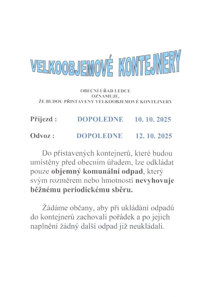 Od pátku 10.10. do neděle 12.10.2025 budou k dispozici velkoobjemové kontejnery.