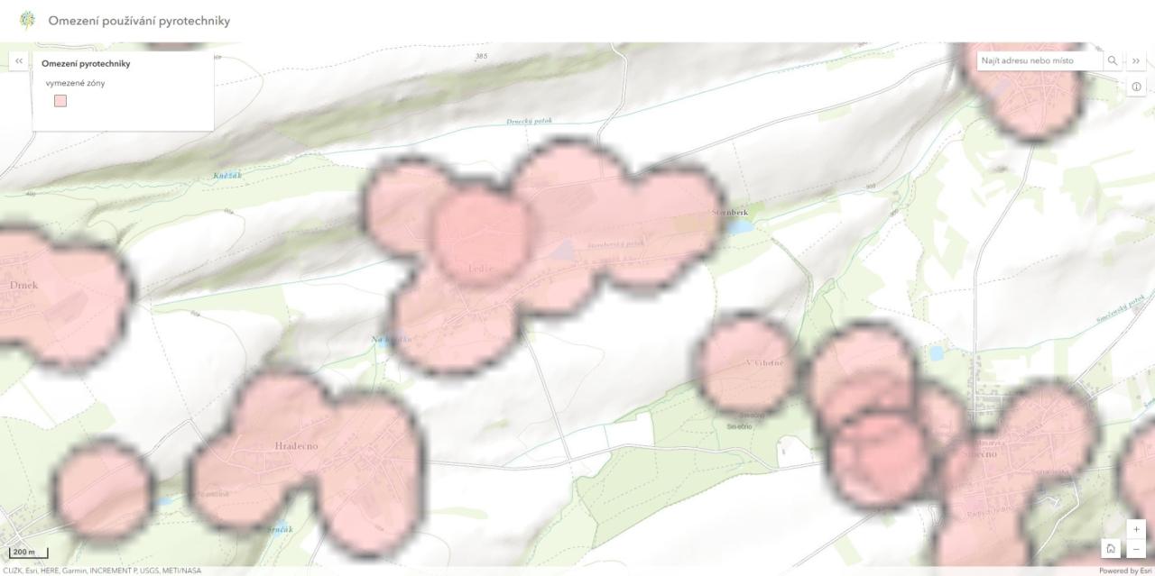 Mapa která je přílohou dokumentu obsahuje zóny, ve kterých je zakázáno zacházet s pyrotechnickými výrobky s výjimkou kategorie F1 podle § 35b zákona č. 344/2025 Sb., kterým se mění zákon č. 206/2015 Sb., o pyrotechnických výrobcích a zacházení s nimi a o změně některých zákonů (zákon o pyrotechnice),